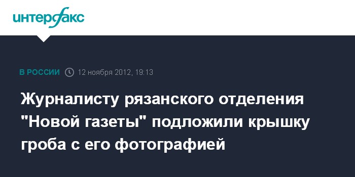 Рязань. 12 ноября. INTERFAX.RU - Спортивный обозреватель рязанского отделения "Новой газеты" Юрий Матыцин обнаружил в понедельник в подъезде дома, в котором проживает, крышку гроба со своей фотографией, сообщил "Интерфаксу" главный редактор издания Алексей Фролов. "Мы расцениваем это как угрозу журналисту", - сказал Фролов.