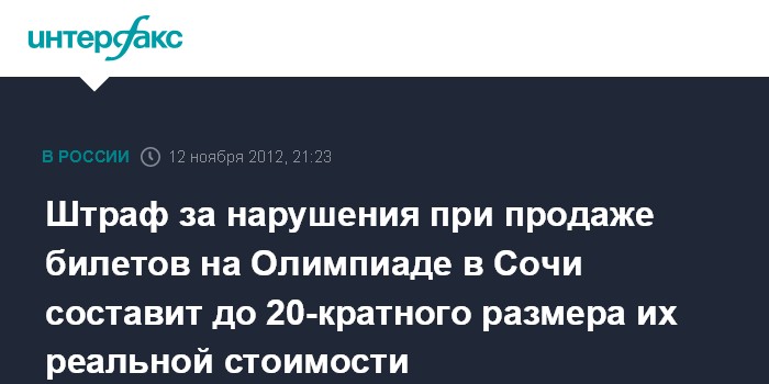 Москва. 12 ноября. INTERFAX.RU - Согласно законопроекту правительства РФ, за нарушение порядка продажи билетов на соревнования и церемонии открытия и закрытия зимних Олимпийских игр 2014 года в Сочи составит до 20-кратного размера номинальной стоимости билетов.