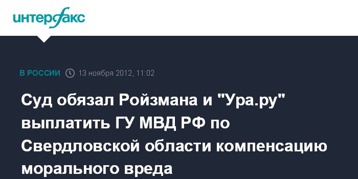 Екатеринбург. 13 ноября. INTERFAX.RU - По решению суда глава фонда "Город без наркотиков" Евгений Ройзман и информагентство "Ура.ру" должны выплатить ГУ МВД РФ по Свердловской области по 5 тыс. рублей в качестве компенсации морального вреда по гражданскому делу о защите чести, достоинства и деловой репутации.