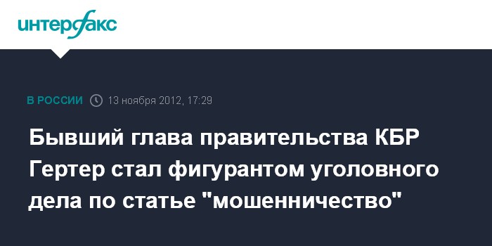 "Следственные органы КБР возбудили уголовное дело в отношении экс-председателя правительства Кабардино-Балкарии Гертера по ст.159 УК РФ (мошенничество в особо крупном размере)", - сообщили "Интерфаксу" в СКР во вторник.