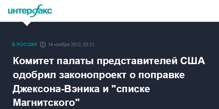 Москва. 14 ноября. ИНТЕРФАКС - Комитет по регламенту палаты представителей конгресса США рекомендовал принять законопроект о "списке Магнитского" и об одновременной отмене поправки Джексона-Вэника полным составом палаты.
