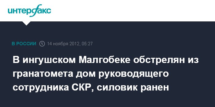 Назрань. 14 ноября. ИНТЕРФАКС-ЮГ - Заместитель руководителя следственного отдела города Малгобек Следственного управления СКР по Ингушетии ранен в результате обстрела неизвестными из гранатомета его домовладения.