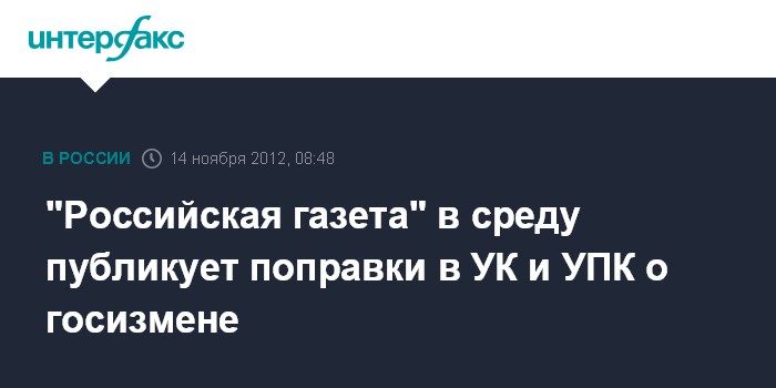 Москва. 14 ноября. INTERFAX.RU - Поправки в Уголовный и Уголовно-Процессуальный Кодексы РФ, которые вводят более широкое понимание государственной измены, шпионажа и разглашения гостайны, в среду опубликованы в "Российской газете".