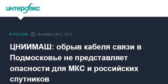 Москва. 14 ноября. INTERFAX.RU - Повреждение кабеля связи в районе Щелковского шоссе, который обеспечивает связью Центр управления полетами, не повлияет на управление российскими спутниками, безопасность работы МКС и самого Центра управления полетами, сообщил "Интерфаксу" в среду гендиректор Центрального НИИ машиностроения, в подчинении которого находится ЦУП, Геннадий Райкунов.