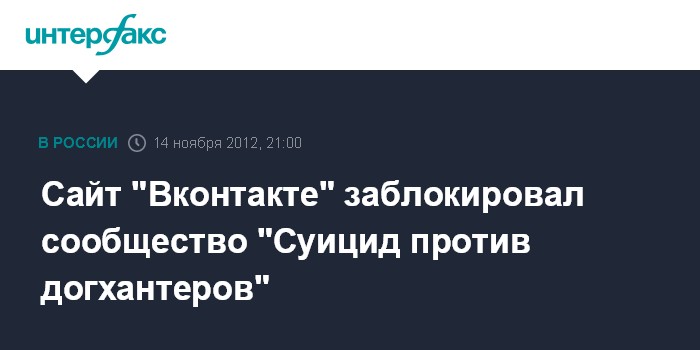 Москва. 14 ноября. INTERFAX.RU - Администрация социальной сети "Вконтакте" заблокировала сообщество "Суицид против догхантеров", попавшее в реестр запрещенных сайтов.