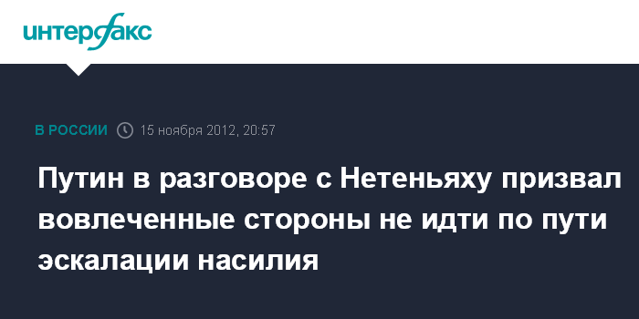 Москва. 15 ноября. INTERFAX.RU- Телефонный разговор президента РФ Владимира Путина с премьер-министром Израиля Биньямином Нетаньяху состоялся в четверг, сообщила пресс-служба Кремля.