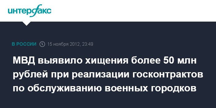 Москва. 15 ноября. INTERFAX.RU - МВД РФ выявило хищения 53 млн рублей при реализации госконтрактов по содержанию объектов военных городков, сообщил журналистам в четверг представитель пресс-центра МВД России.