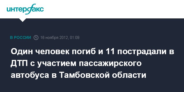 Элиста. 16 ноября. INTERFAX.RU - 11 человек пострадали и один погиб в результате столкновения пассажирского автобуса с КАМАЗом в Тамбовской области, сообщил "Интерфаксу" в пятницу представитель пресс-службы МЧС по Тамбовской области.