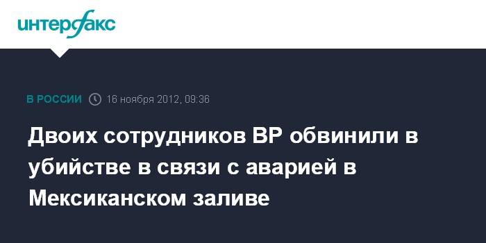 Нью-Йорк. 16 ноября. INTERFAX.RU - Власти США предъявили уголовные обвинения троим сотрудникам британского нефтяного гиганта BP об убийстве и препятствовании следствию в связи с аварией на платформе Deepwater Horizon в Мексиканском заливе весной 2010 года.