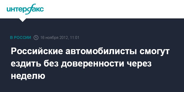 Москва. 16 ноября. INTERFAX.RU - Российским автомобилистам необязательно будет иметь доверенность на управление автомобилем с 24 ноября - в этот день вступит в силу соответствующее постановление правительства РФ.