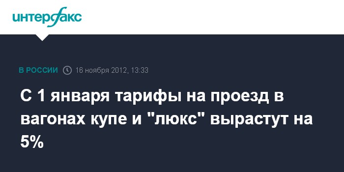 Москва. 16 ноября. INTERFAX.RU - С 1 января 2013 года тарифы на проезд в вагонах купе и "люкс" поездов дальнего следования вырастут на 5%, следует из сообщения ОАО "Российские железные дороги" (РЖД).