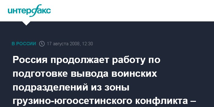 Москва. 17 августа. INTERFAX.RU - Работа по подготовке вывода миротворцев и частей 58-й армии из зоны грузино-югоосетинского конфликта продолжается, сообщил журналистам в воскресенье замначальника Генштаба ВС РФ Анатолий Ноговицын.
