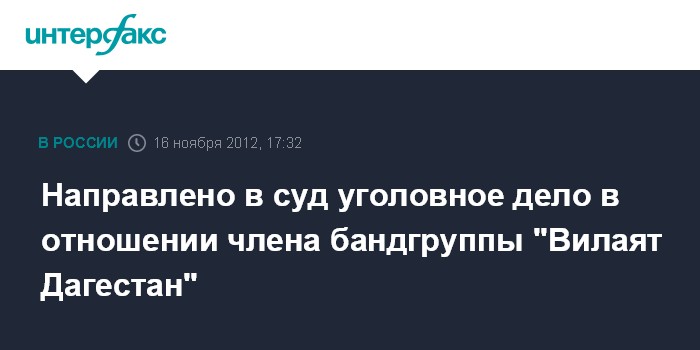 Москва. 16 ноября. INTERFAX.RU - Направлено в суд уголовное дело в отношении еще одного члена бандгруппы "Вилаят Дагестан", обвиняемого в терроризме, убийствах и бандитизме, сообщил официальный представитель СК РФ Владимир Маркин.