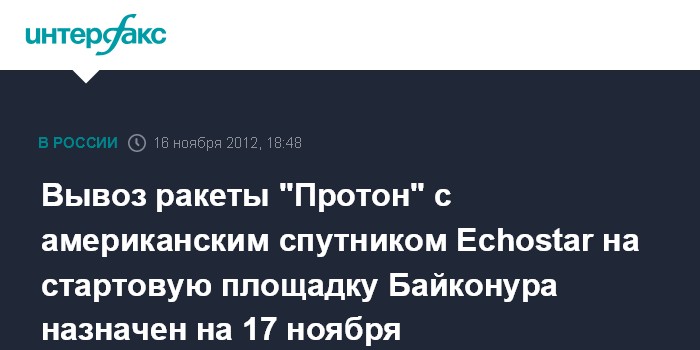 Байконур. 16 ноября. INTERFAX.RU - Государственная комиссия РФ приняла решение о том, что вывоз на стартовый комплекс Байконура ракеты-носителя "Протон-М" с американским телекоммуникационным космическим аппаратом "Экостар-16" (Echostar 16) должен состояться в субботу, 17 ноября, сообщил в пятницу агентству "Интерфакс-Казахстан" источник на космодроме.