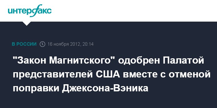 Ранее комитет по регламенту палаты представителей конгресса США рекомендовал принять "законопроект Магнитского", увязав это с отменой поправки Джексона-Вэника. После утверждения в палате представителей документ рассмотрит Cенат.