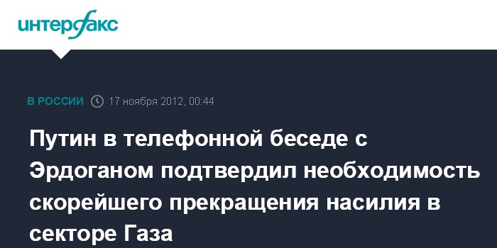 Москва. 17 ноября. ИНТЕРФАКС - Президент России Владимир Путин обсудил с премьером Турции Реджепом Тайипом Эрдоганом по телефону ситуацию в секторе Газа.