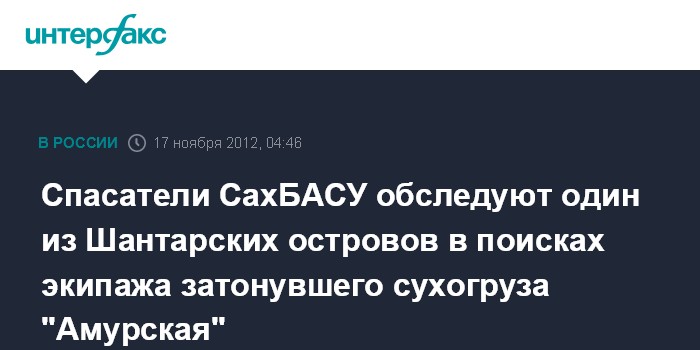 Южно-Сахалинск. 17 ноября. ИНТЕРФАКС-ДАЛЬНИЙ ВОСТОК - Спасательный буксир "Рубин" СахБАСУ, подошедший утром в субботу в район поиска экипажа сухогруза "Амурская", в настоящее время направился к острову Беличий (Шантарские острова) для осмотра острова и предмета, предположительно, спасательного плота, который обнаружили в четверг летчики МЧС во время облета островов на самолете Бе-200, сообщили агентству "Интерфакс - Дальний Восток" в морском спасательном подцентре МСПЦ "Южно-Сахалинск".