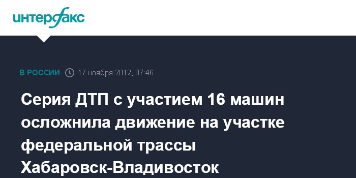 Владивосток. 17 ноября. ИНТЕРФАКС-ДАЛЬНИЙ ВОСТОК - Пять дорожных аварий с участием 16 автомобилей произошли в субботу в районе 29 километра федеральной трассы Хабаровск-Владивосток, сообщила агентству "Интерфакс-Дальний Восток" представитель ГИБДД Владивостока.