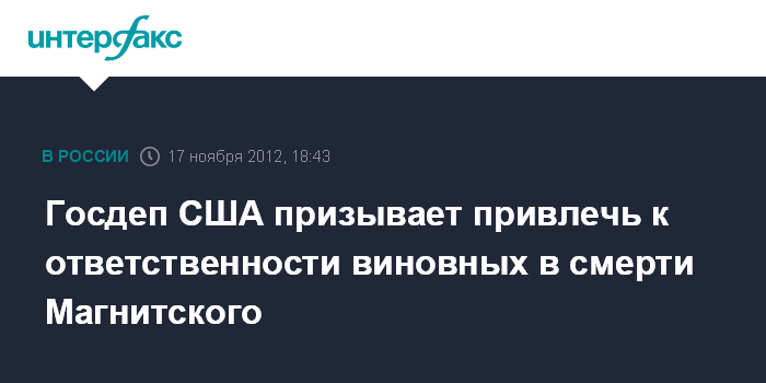 Вашингтон. 17 ноября. INTERFAX.RU - Вашингтон призвал наказать виновных в смерти юриста Сергея Магнитского, скончавшегося в СИЗО три года назад, заявила в субботу представитель госдепа США Виктория Нуланд в официальном коммюнике, выпущенном по случаю годовщины смерти юриста. "Мы чтим память российского юриста С.Магнитского, погибшего (…) в московской тюрьме после того, как его обвинили в коррупции", - говорится в коммюнике.