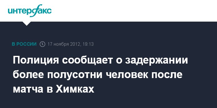 Москва. 17 ноября. INTERFAX.RU - После футбольного матча в Химках задержаны 53 человека, сообщили "Интерфаксу" в пресс-центре МВД. "Задержаны 53 фаната, в том числе молодой человек, который предположительно бросил на поле файер", - отметили в пресс-центре.