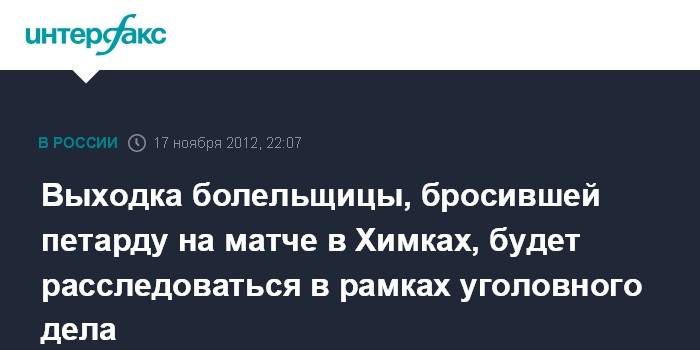 "По факту происшествия на матче между московским "Динамо" и петербургским "Зенитом", в ходе которого во вратаря столичного клуба было брошено с трибун пиротехническое устройство, причинившее ему травму, будет возбуждено уголовное дело по ч. 1 ст. 213 УК РФ (хулиганство)", - сказал Е.Гильдеев.