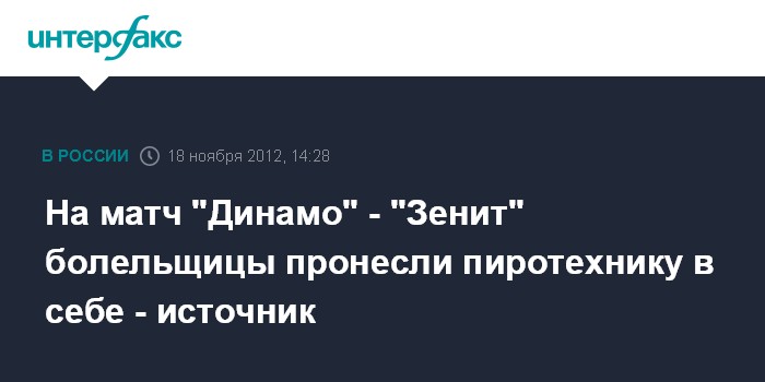 Москва. 18 ноября. INTERFAX.RU - Петарды на матч между столичным "Динамо" и питерским "Зенитом", проходившем накануне в Химках, на стадион были пронесены внутриполостным способом, сообщил в воскресенье "Интерфаксу" источник в правоохранительных органах.