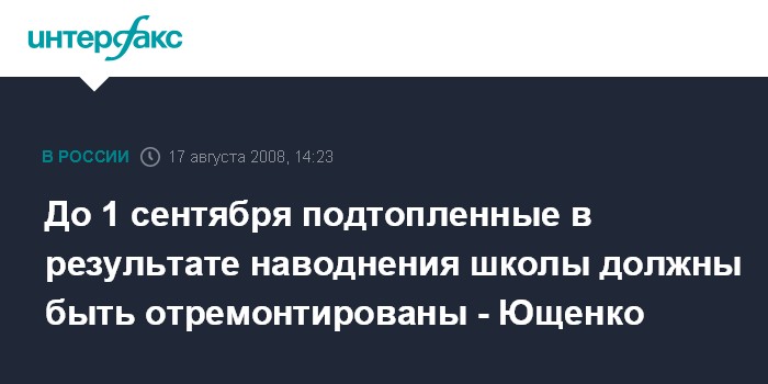 Киев. 17 августа. INTERFAX.RU - До 1 сентября должен завершиться ремонт во всех подтопленных школах тех районов которые были объявлены зоной чрезвычайной экологической ситуации, заявляет президент Украины Виктор Ющенко.