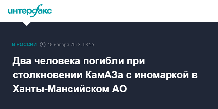 Ханты-Мансийск. 19 ноября. INTERFAX.RU - Грузовой КАМАЗ врезался в иномарку на 22 км автодороги Нижневартовск-Радужный (Ханты-Мансийский автономный округ), два человека погибли, сообщает пресс-служба управления МВД РФ по ХМАО.