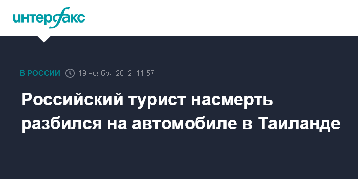 Москва. 19 ноября. INTERFAX.RU - Россиянин погиб в автомобильной аварии на острове Пхукет в минувшую субботу, не справившись с управлением своей машины, сообщает местный портал Phuketwan.
