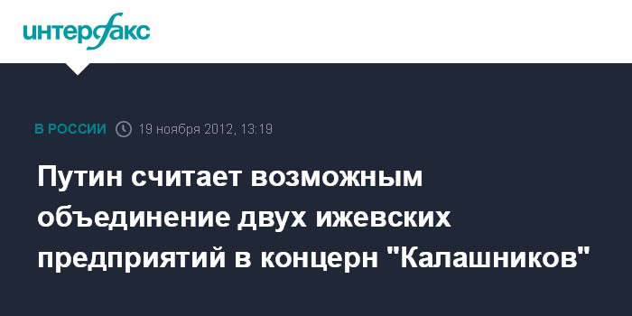 Ново-Огарево. 19 ноября. INTERFAX.RU - Президент России Владимир Путин поручает обратить внимание на социальные вопросы при возможном объединении предприятий "Ижмаш" и "Ижмех" в рамках госкорпорации "Ростехнологии" под общим брендом "Калашников". "Что касается объединения, это, конечно, возможно", - заявил он на встрече с вице-премьером Дмитрием Рогозин, который выдвинул такое предложение.