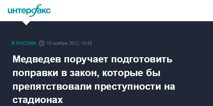 Горки. 19 ноября. INTERFAX.RU - Премьер-министр РФ Дмитрий Медведев поручил правительству подготовить изменения в законодательство, которые предотвращали бы преступления, подобные тому, которое было совершено на матче "Динамо" - "Зенит" на стадионе в Химках. "Это очень печальный инцидент, но если говорить прямо, то это не инцидент, а преступление, причем преступление умышленное. Уголовное дело по этому поводу возбуждено, но надо подготовить такие изменения в законодательство, которые были бы направлены на предотвращение таких правонарушений, таких преступлений", - заявил Медведев на встрече со своими заместителями.