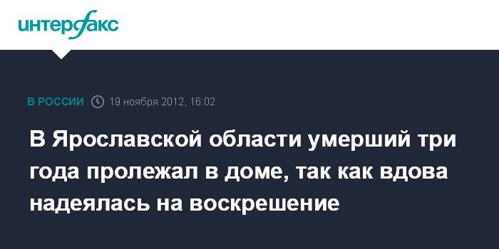 Ярославль. 19 ноября. INTERFAX.RU - Следствие прекратило уголовное дело по факту обнаружения тела жителя Ярославской области, которое три года хранила в квартире его супруга, сообщает СУ СКР по региону в понедельник. По информации следствия, мужчина умер из-за тяжелой болезни. Его жена надеялась, что он воскреснет.