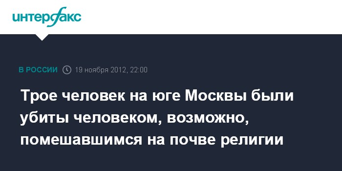 Москва. 19 ноября. INTERFAX.RU - Мужчина, убивший трех человек на юге Москвы, является религиозным фанатиком и, возможно, нездоров психически, сообщил "Интерфаксу" источник в правоохранительных органах.