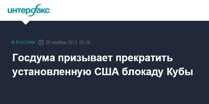 Москва. 20 ноября. ИНТЕРФАКС - Госдума во вторник обратится к парламентам государств - членов ООН с призывом о необходимости прекращения экономической, торговой и финансовой блокады Кубы.