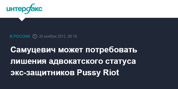 Москва. 20 ноября. INTERFAX.RU - Условно освобожденная Мосгорсудом участница Pussy Riot Екатерина Самуцевич может поднять вопрос о лишении адвокатского статуса ранее защищавших девушек из панк-группы Марка Фейгина, Николая Полозова и Виолетты Волковой, пишет во вторник газета "Коммерсант".