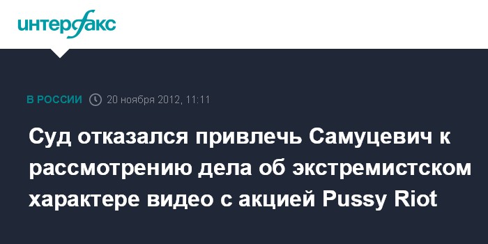 Москва. 20 ноября. INTERFAX.RU - Замоскворецкий суд Москвы отказался считать заинтересованной стороной участницу панк-группы Pussy Riot Екатерину Самуцевич в рамках рассмотрения требования прокуратуры признать экстремистским ролик со скандальным выступлением коллектива в храме Христа Спасителя.