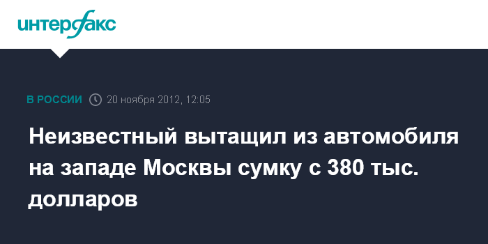 Москва. 20 ноября. INTERFAX.RU - Неизвестный похитил более 380 тысяч долларов США из машины на западе столицы, сообщили "Интерфаксу" в пресс-службе ГУ МВД России по Москве.