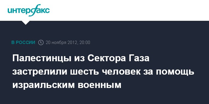 Иерусалим. 20 ноября. INTERFAX.RU - В Секторе Газа вооруженные люди застрелили шестерых человек, которые, предположительно, помогали израильским военным осуществлять авиаудары по сектору Газа, сообщает во вторник радиостанция "Акса" со ссылкой на источник в местных структурах безопасности.