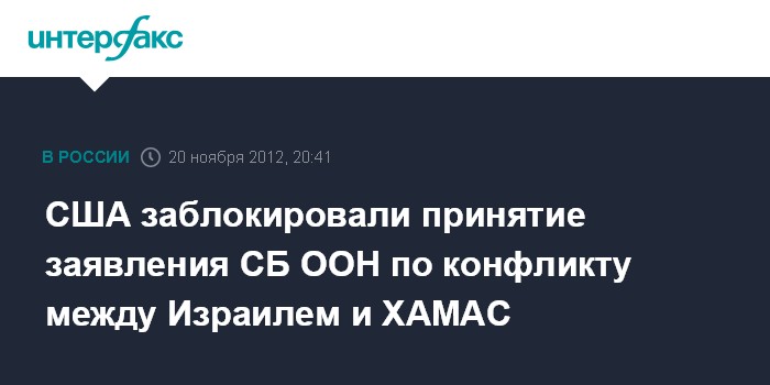 Нью-Йорк (ООН). 20 ноября. INTERFAX.RU - Американские дипломаты объявили во вторник, что заблокировали процесс принятия заявления СБ ООН, в котором планировалось выразить тревогу по поводу эскалации конфликта между Израилем и палестинцами из Cектора Газа.