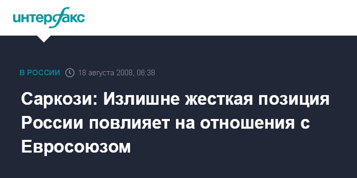 Москва. 18 августа. ИНТЕРФАКС - Излишне жесткая позиция России по отношению к соседним странам осложнит ее взаимодействие с Евросоюзом, заявил президент Франции Николя Саркози, передает телеканал "Вести".