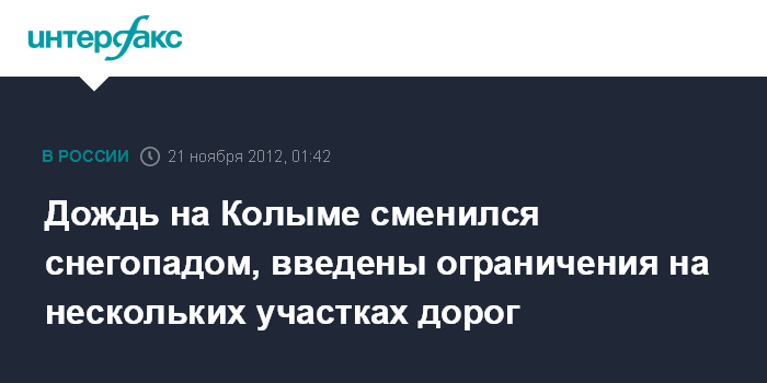 Магадан. 21 ноября. ИНТЕРФАКС-ДАЛЬНИЙ ВОСТОК- В ночь на среду на Колыму обрушился снегопад, что стало неожиданность для жителей региона, поскольку во вторник в области шел дождь, дорожные службы ввели ограничения на нескольких участках территориальных дорог.