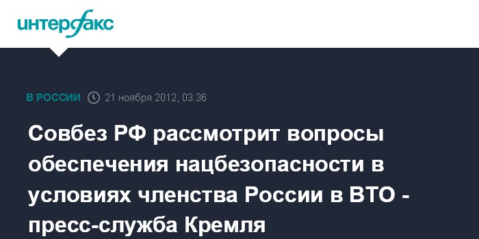 Совбез РФ рассмотрит вопросы обеспечения нацбезопасности в условиях членства России в ВТО - пресс-служба Кремля
