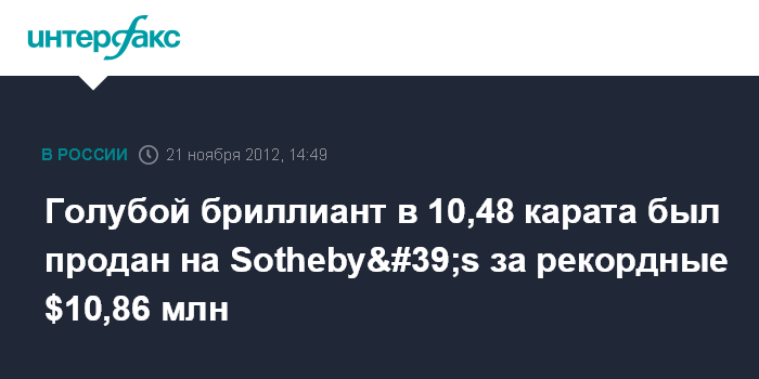 Голубой бриллиант в 10,48 карата был продан на Sotheby's за рекордные $10,86 млн