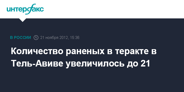 Иерусалим. 21 ноября. INTERFAX.RU - Число пострадавших в результате взрыва автобуса в центре Тель-Авива возросло до 21, сообщает израильская газета "Гаарец".
