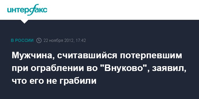 Москва. 22 ноября. INTERFAX.RU - Гражданин, у которого, предположительно, во "Внуково" украли 75 млн рублей, заявил полицейским, что на него никто не нападал и денег не похищал, сообщил "Интерфаксу" источник в правоохранительных органах.