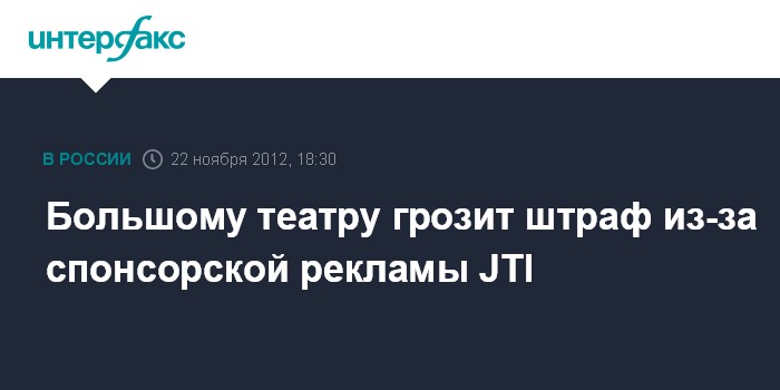 Москва. 22 ноября. INTERFAX.RU - Большому театру грозит штраф из-за спонсорской рекламы Japan Tobacco International на брошюрах с репертуаром, следует из сообщения Федеральной антимонопольной службы (ФАС) РФ.