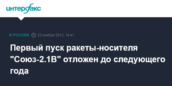 Москва. 23 ноября. INTERFAX.RU - Первый испытательный пуск ракеты-носителя "Союз-2.1В" состоится не ранее весны в связи с задержкой, вызванной аварией при проведении огневых испытаний первой ступени ракеты-носителя.