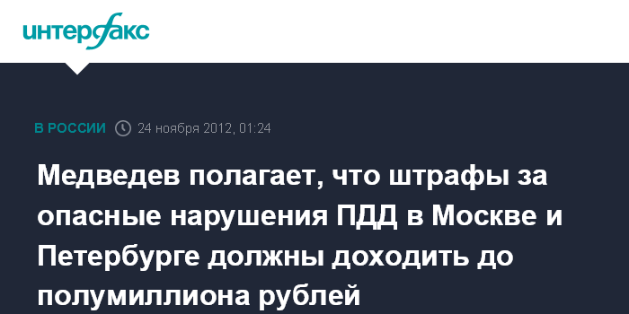 Москва. 24 ноября. ИНТЕРФАКС - Премьер-министр РФ Дмитрий Медведев заявил, что ответственность за наиболее опасные нарушения правил дорожного движения в Москве и Санкт-Петербурге, возможно, следует довести до 500 тыс. рублей, для других регионов - до 250 тыс. рублей.