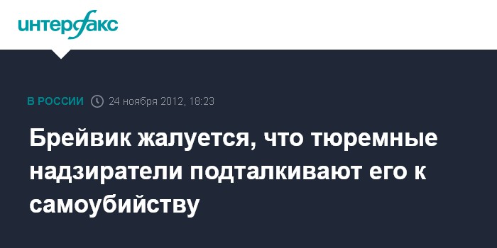 Осло. 24 ноября. INTERFAX.RU - Норвежский террорист Андерс Брейвик пожаловался в 27-страничном письме на то, что тюремные надзиратели склоняют его к самоубийству, передает агентство "Ассошиэйтед пресс".