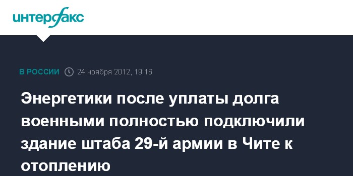 Ранее в субботу директор по связям с общественностью энергокомпании Антон Шошин сообщил агентству "Интерфакс-Сибирь", что ОАО "ТГК-14" за долги отключило в Чите часть здания штаба 29-й армии Восточного военного округа.
